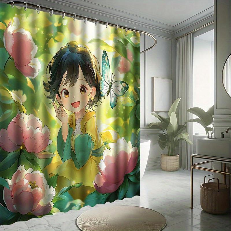 Cartoon Girl Shower Curtain Set, Butterfly & Floral Design, Water-Resistant Polyester, Bathtub Partition, All-Season
