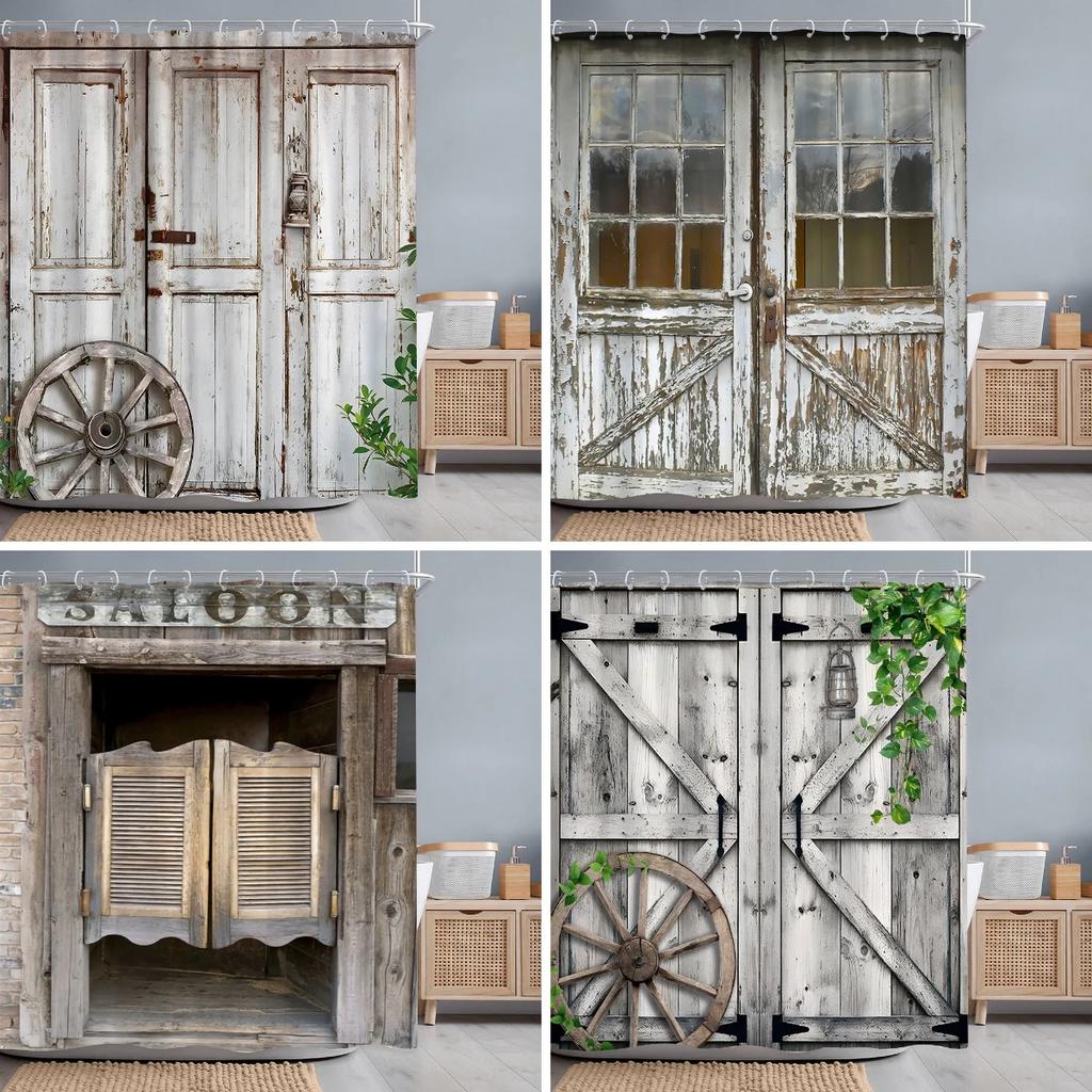 Vintage Wooden Door Shower Curtain Rustic Door Window Wheel Botanical Barn Polyester Shower Curtains Bathroom Decor with Hooks