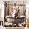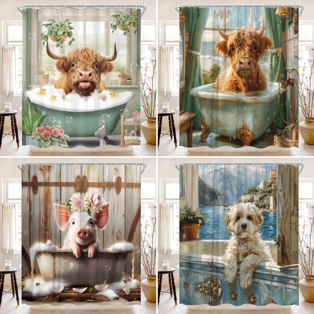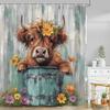 Funny Highland Cow Shower Curtain Farm Cartoon Pig Dog Flower Plant Rustic Farmhouse Kid Polyester Fabric Bathroom Decor Curtain
