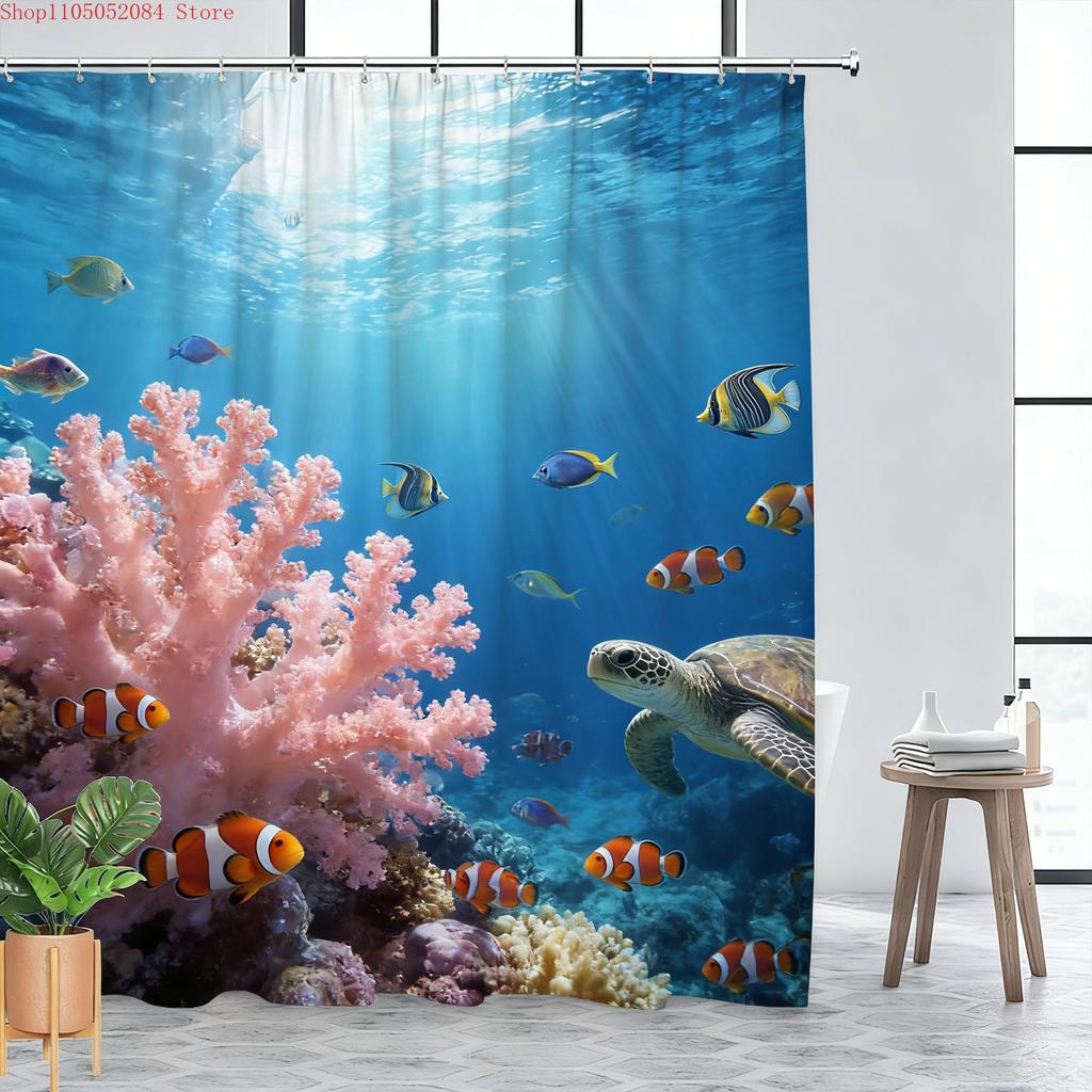 Vibrant Underwater Coral Reef with Sea Turtle & Clownfish Waterproof Shower Curtain for Bathroom Decor