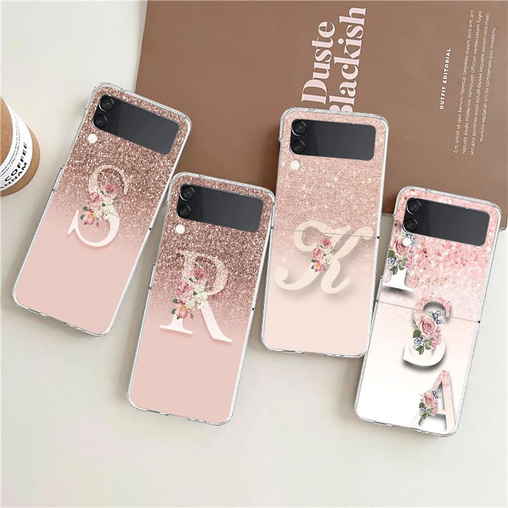 Letter Pink Shiny M R Phone Case For Samsung Galaxy Z Flip 3 4 5 Hard Folding Clear PC Bumper For Samsung Z Flip 6 Cover