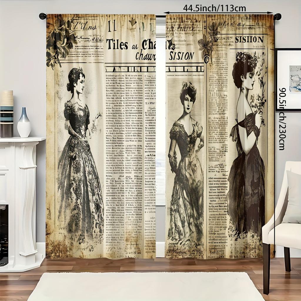 2PC Vintage Newspaper Victorian Lady Sheer Curtains - Retro French Fashion Print Window Drapes for Living Room Bedroom Decor