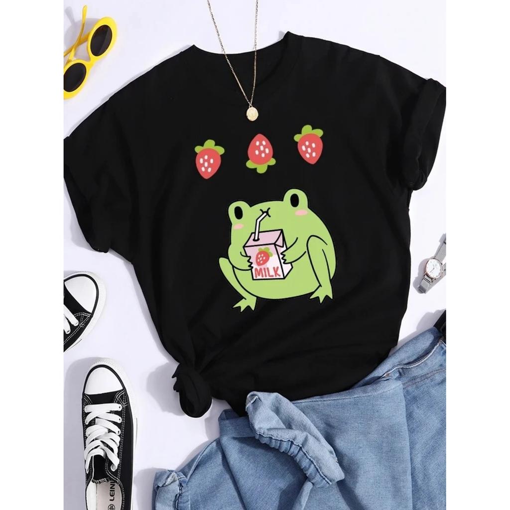 Green Frog T-shirts for Women Who Love To Drink Strawberry Flavored Milk Soft T-shirts Sports Summer T-shirts Street Hiphop Tops
