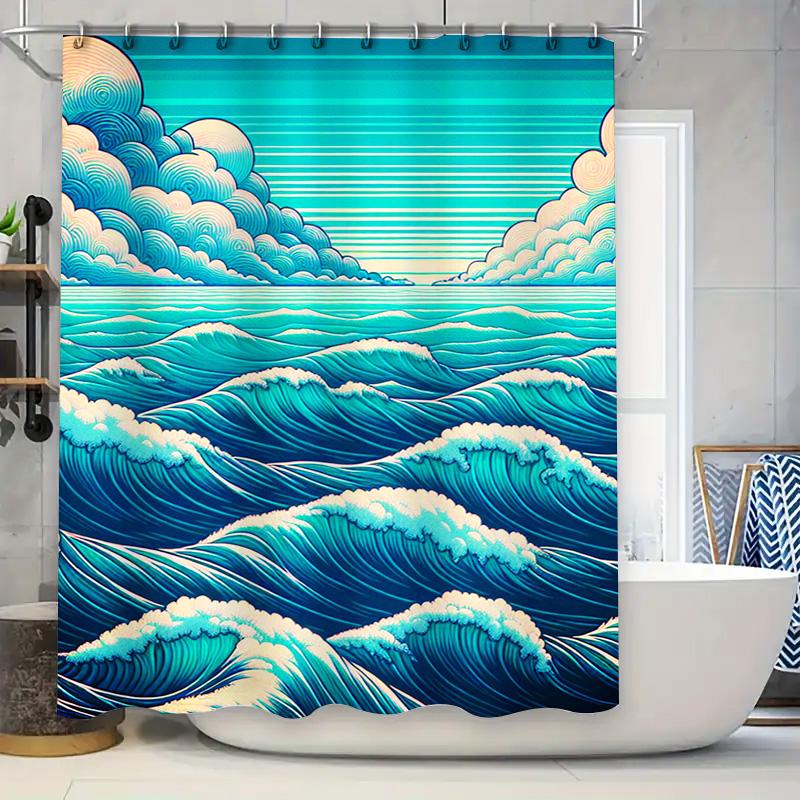 Ocean Blue Waves Shower Curtain with Clouds Waterproof Fabric for Bathroom Decor Artistic Modern Design 72x84 Inches