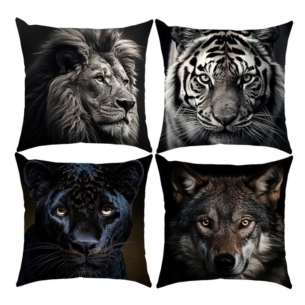 Four Animal Head Pillowcases: Lion, Tiger, Black Panther, and Wolf Sofa Cushion Cover Home Room Decoration 2D Flat Printing