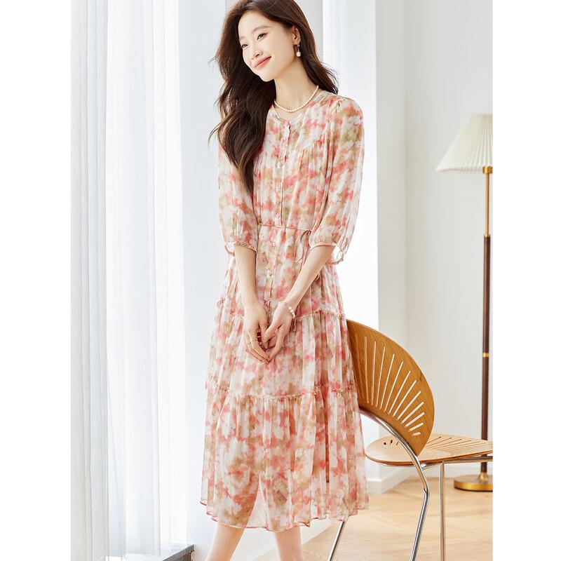 Srcr Women's Elegant French Style Mulberry Silk Floral Dress