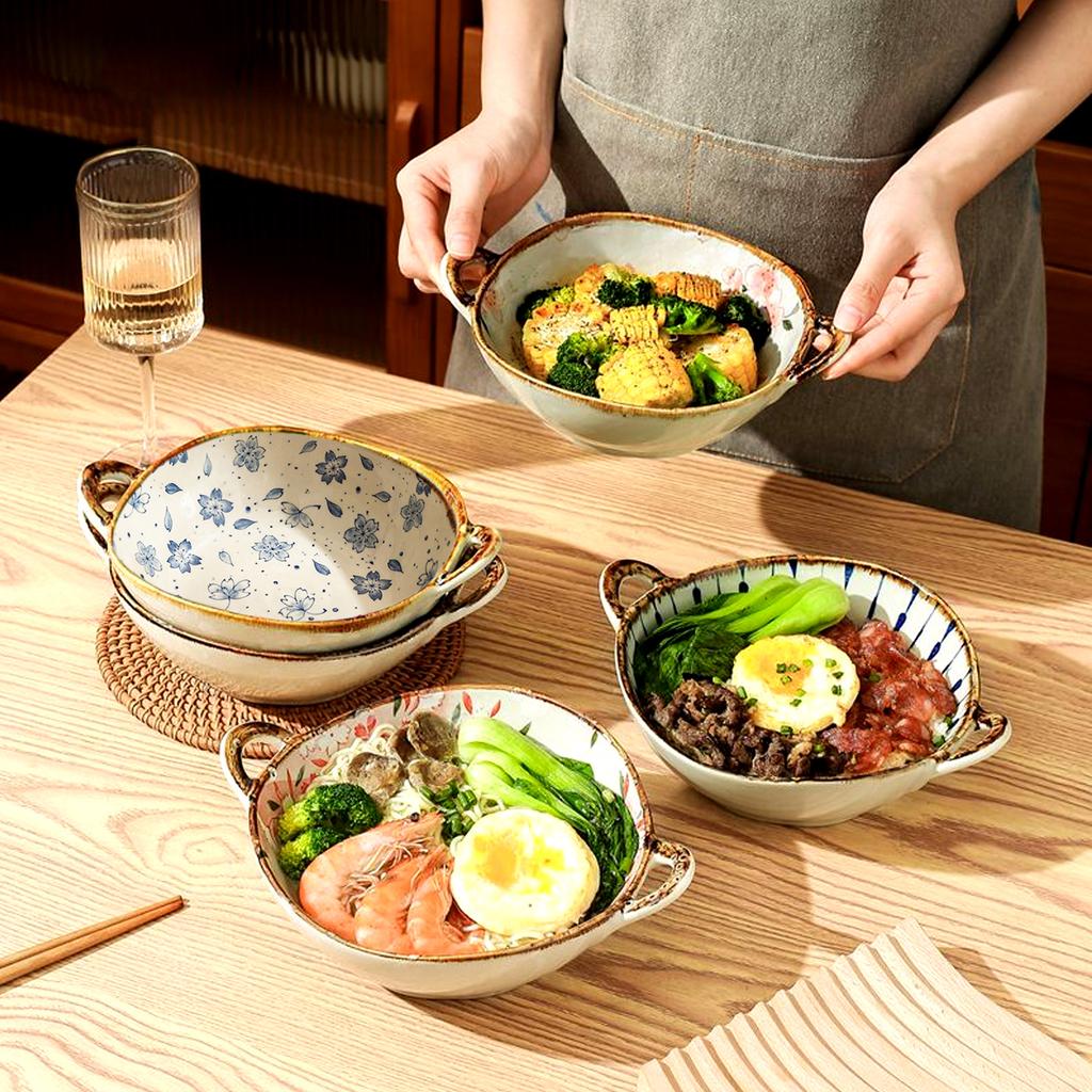7.5inch Japanese Household Noodle Bowl Ceramic Soup Bowl With Handle Salad Pasta Bowl Kitchen Tableware Microwave Oven Bakware