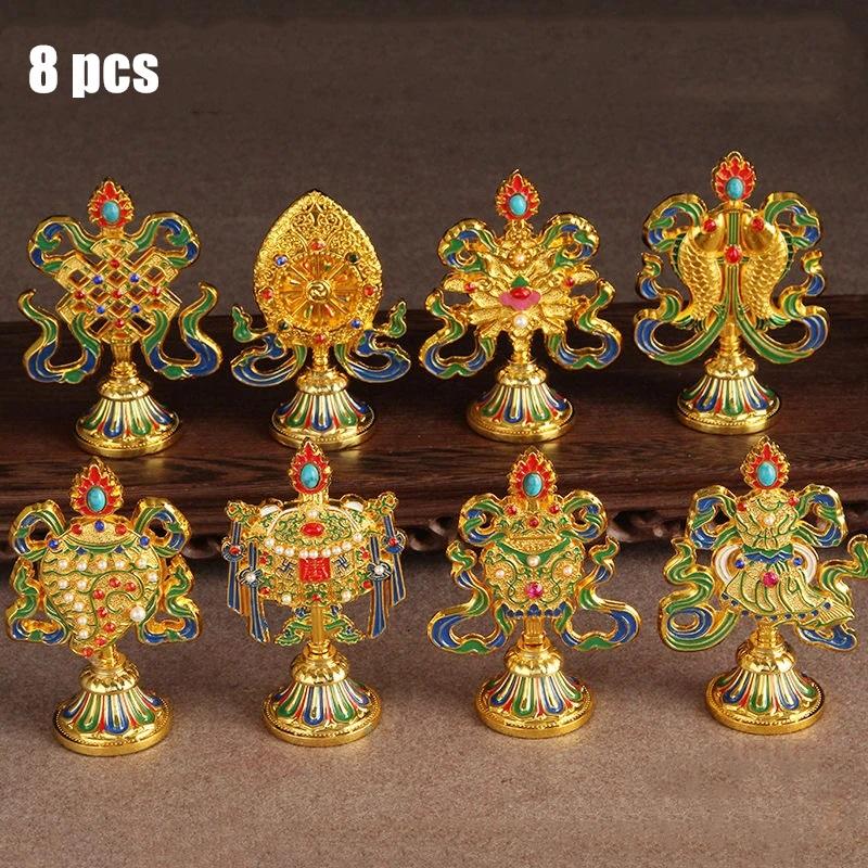 8 Pcs Painted Tibetan Engraved Eight Treasures Auspicious Statue Tantric Alloy Handicraft Buddhism Home Gift Desktop Decorative