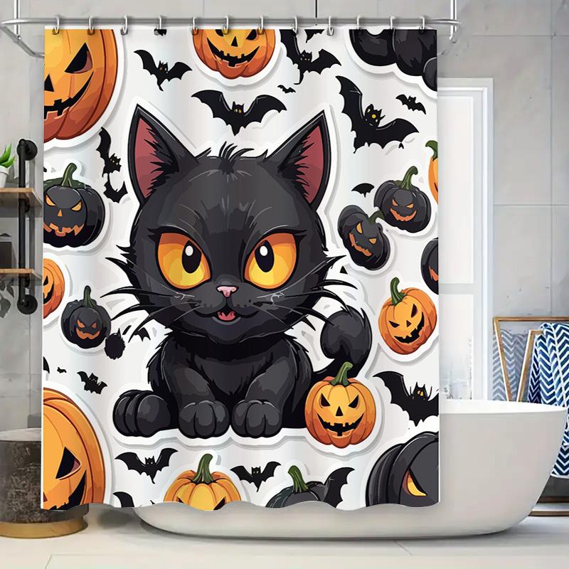 Halloween Decor Shower Curtain Set with Black Cat Pumpkin Bats Print Waterproof Fabric Bathroom Liner for Kids Gifts