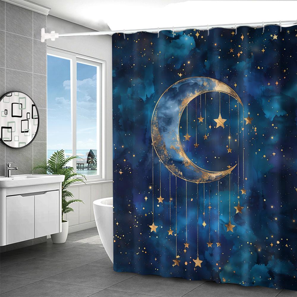 Starry Night Moon Shower Curtain – Crescent & Stars Print, Polyester with No-Drill Hooks for Celestial-Themed Bathroom Decor