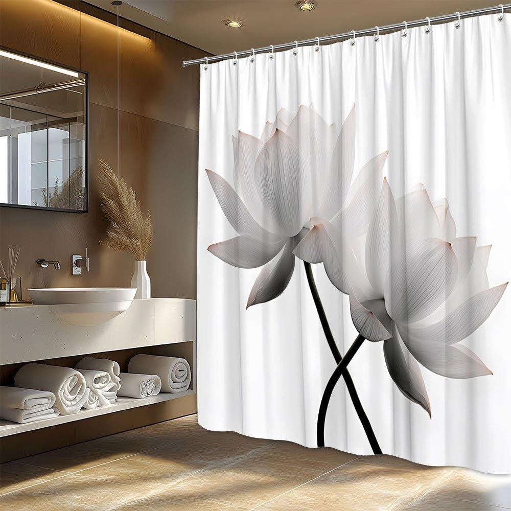 1pc Zen-Inspired Shower Curtain - White Lotus, Reflective Water & Grasses, Polyester, Tranquil Bathroom Decor