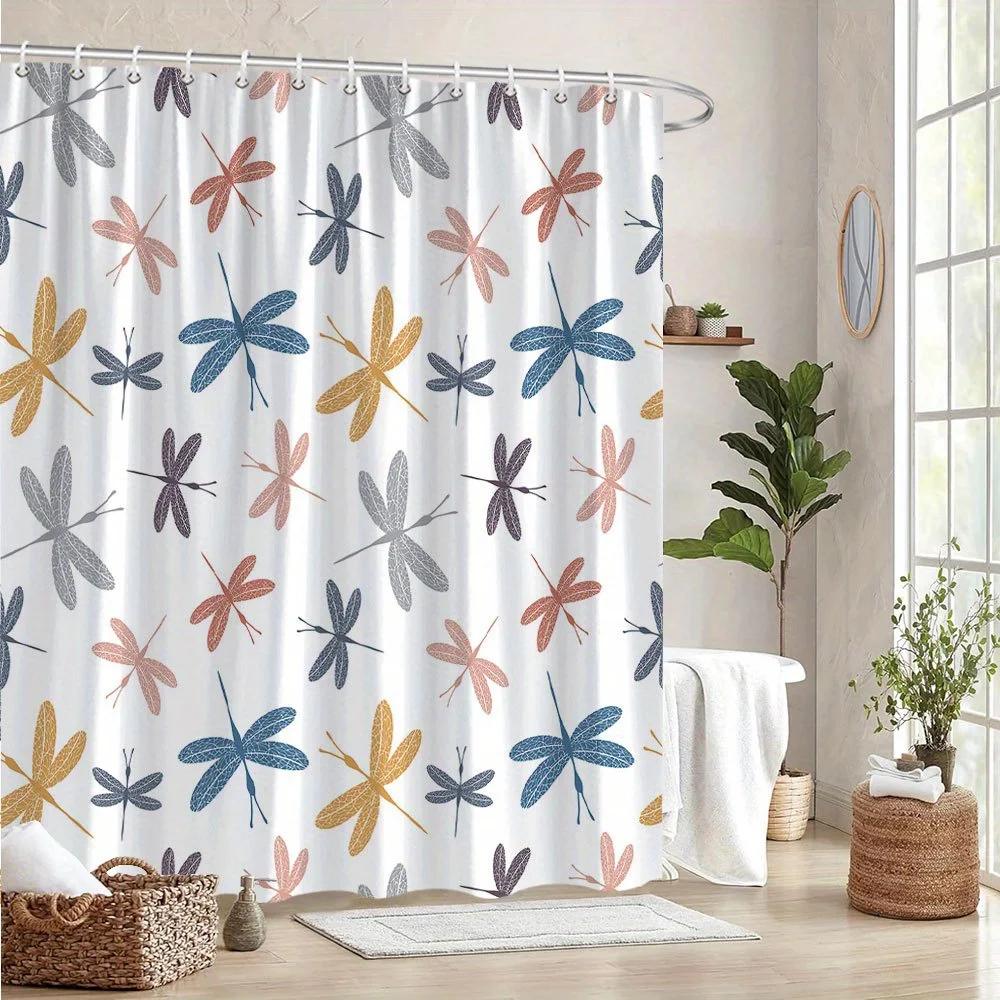 Dragonfly Pattern Shower Curtain - Minimalist Design In Pink, Blue,Yellow & Gray,12 Hooks,Hand-Drawn Quality, Playful Bath Decor