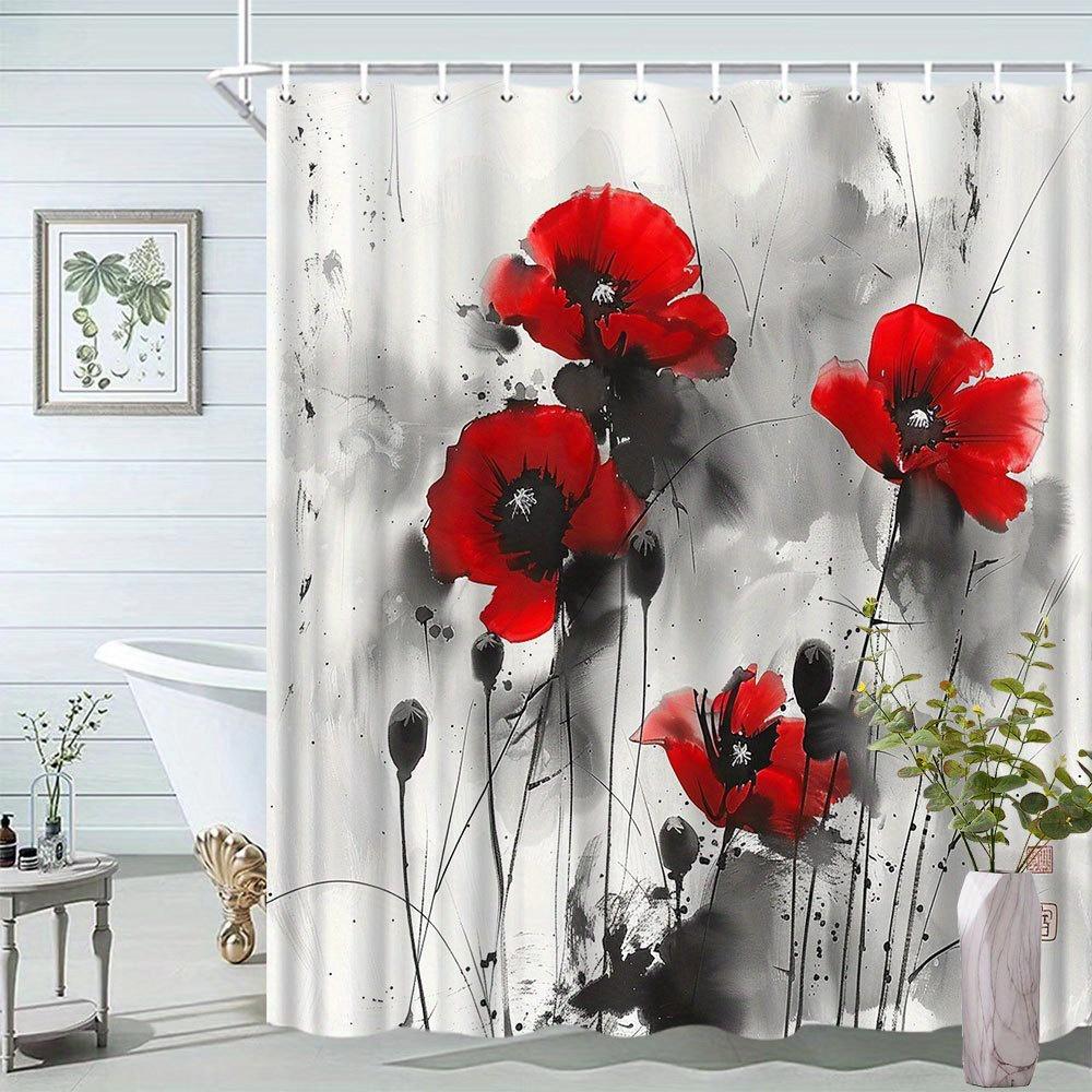 1pc Floral Shower Curtain Red Poppy Pattern Ink Watercolor Style Bathroom Decoration Polyester Fabric Contains 12 Hooks