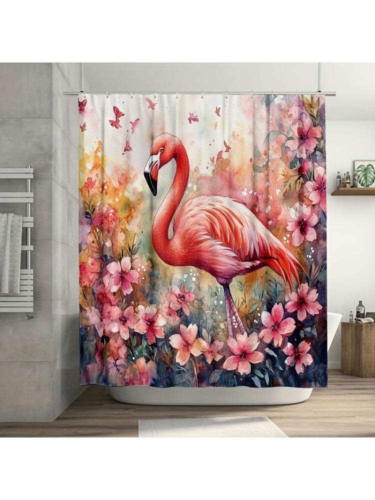 1PC Vibrant Watercolor Flamingo Shower Curtain, Pink Flowers, Durable Polyester, Easy Clean, for Bathroom & Window Decor