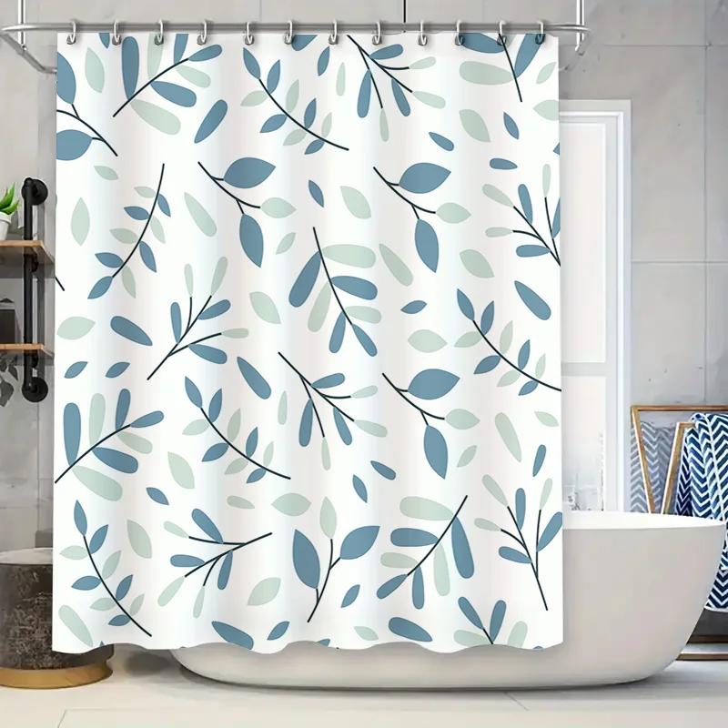 Modern Bathroom Shower Curtain Set Blue Leaves Print, Waterproof Fabric with Hook Rings Decorative Window Hanging Liner for Home