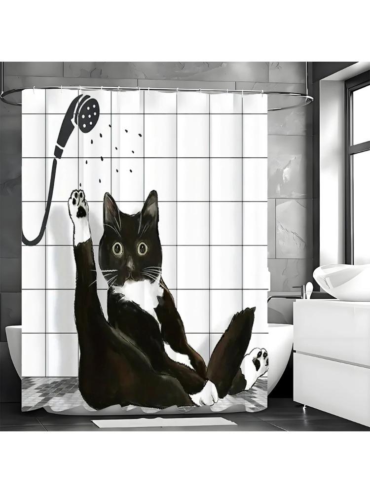 Black Cat Shower Curtain, Bathroom Decorative Shower Curtain, Waterproof Shower Curtain with Hooks