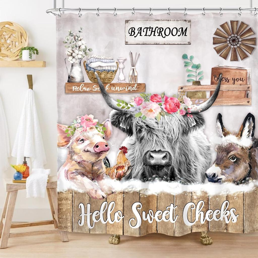 Imirell Rustic Highland Cow Shower Curtain 60Wx72H Inches Farm Funny Animal Farmhouse Donkey Chicken Pig Flower Wooden Country W
