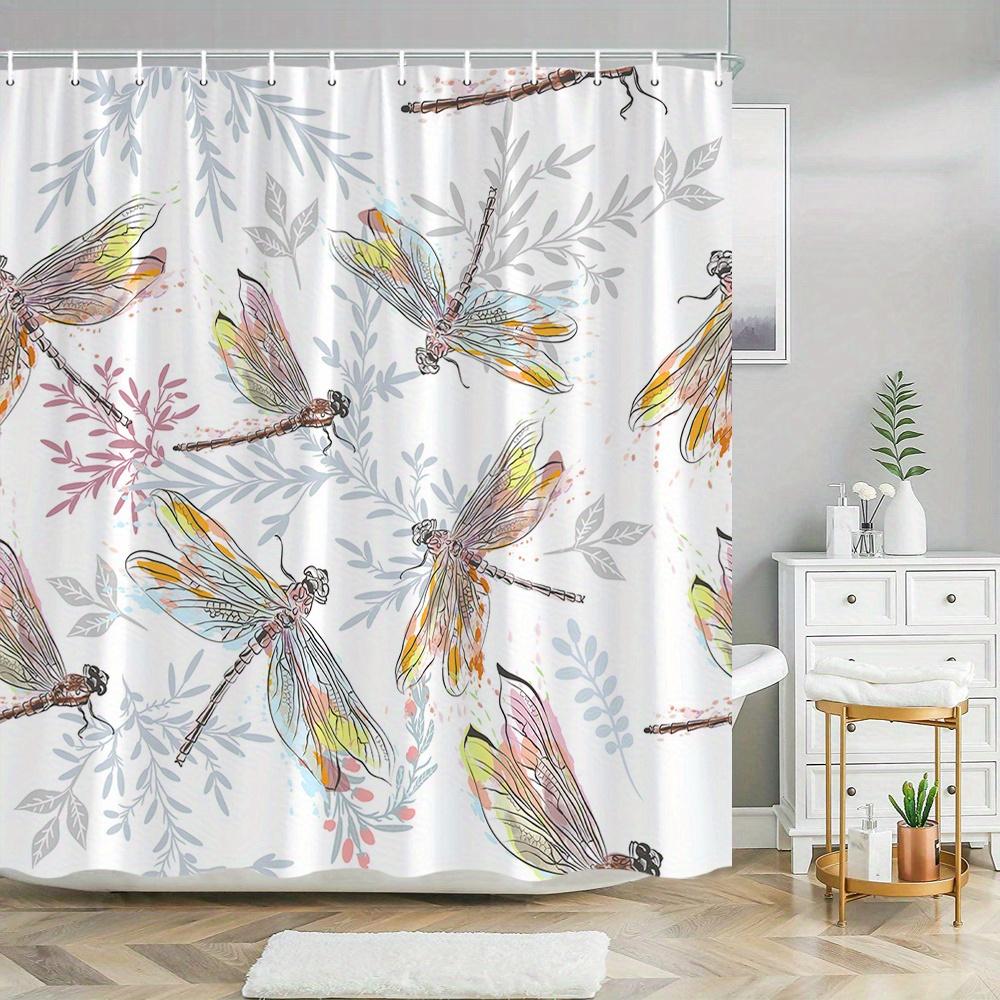 1pc Dragonfly and Leaves Shower Curtain - Natural Watercolor Pattern, Machine Washable, Polyester Fabric, Machine Washable