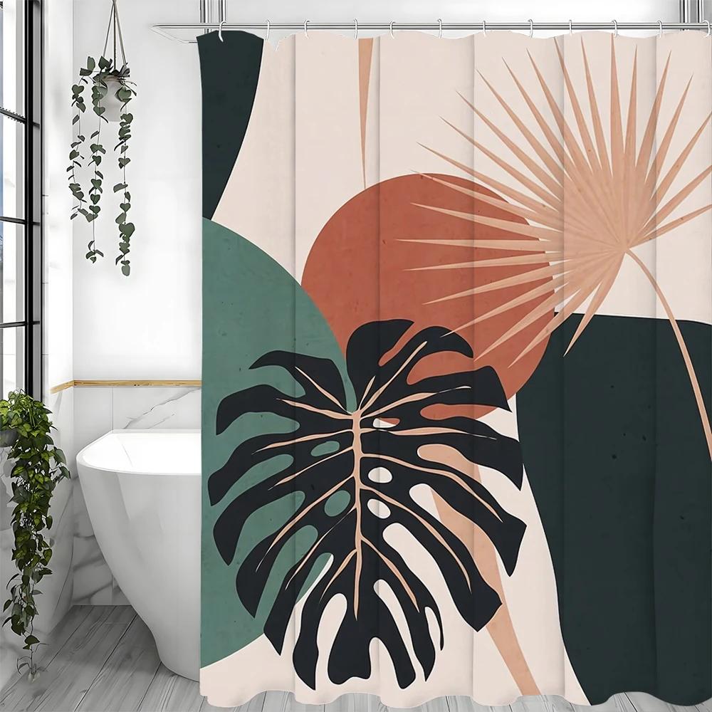 Mid Century Modern Bohemian Shower Curtain, Bohemian Arched Leaf Abstract Bathroom Decorative Shower Curtain, Waterproof Shower