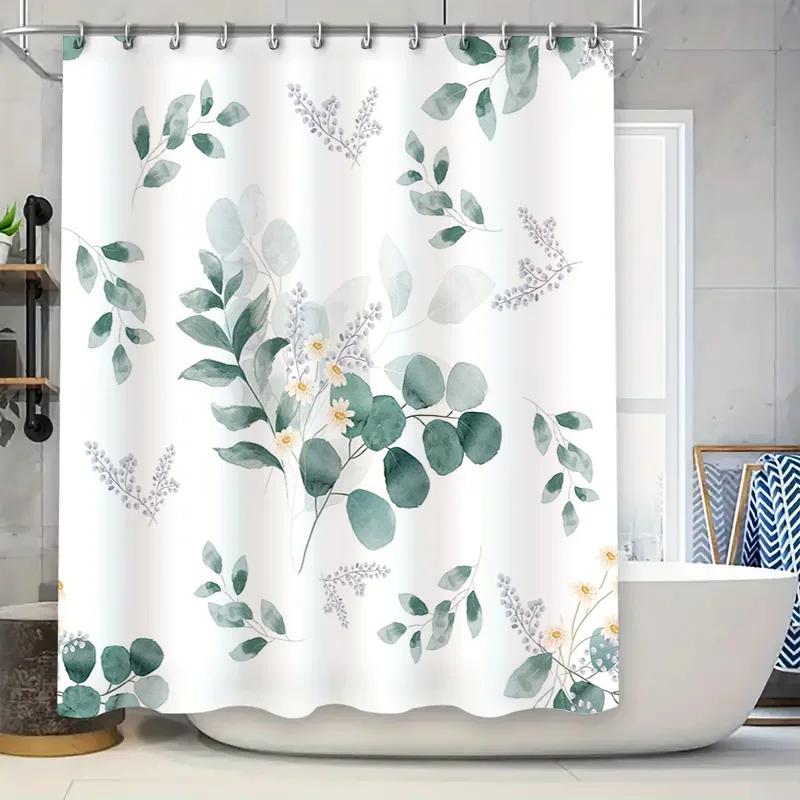 Green Leaf Pattern Shower Curtain Waterproof Bath Decor Home Decoration Customizable Size Available White Flower Design Shabby C