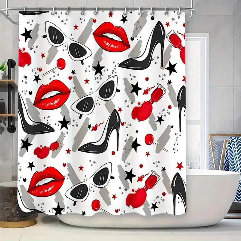 Stylish Personalized Shower Curtain Waterproof & Anti-Mold Bathroom Accessory High Heels Red Lips Sunglasses Pattern Easy-Clean