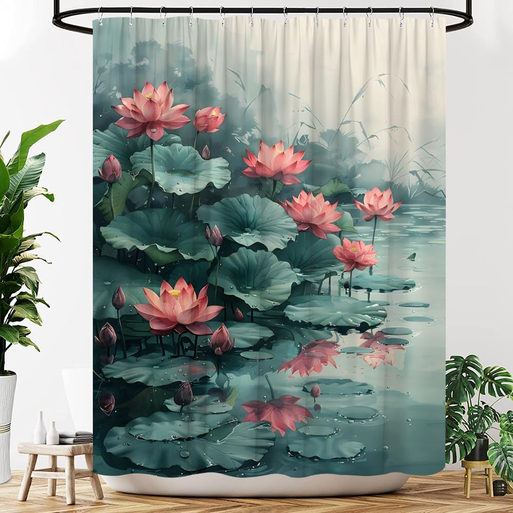 Lotus Shower Curtain Asian Chinese Japanese Oil Painting Green Leaves Elegant Floral Botanical Aesthetic Women Girls Bathroom