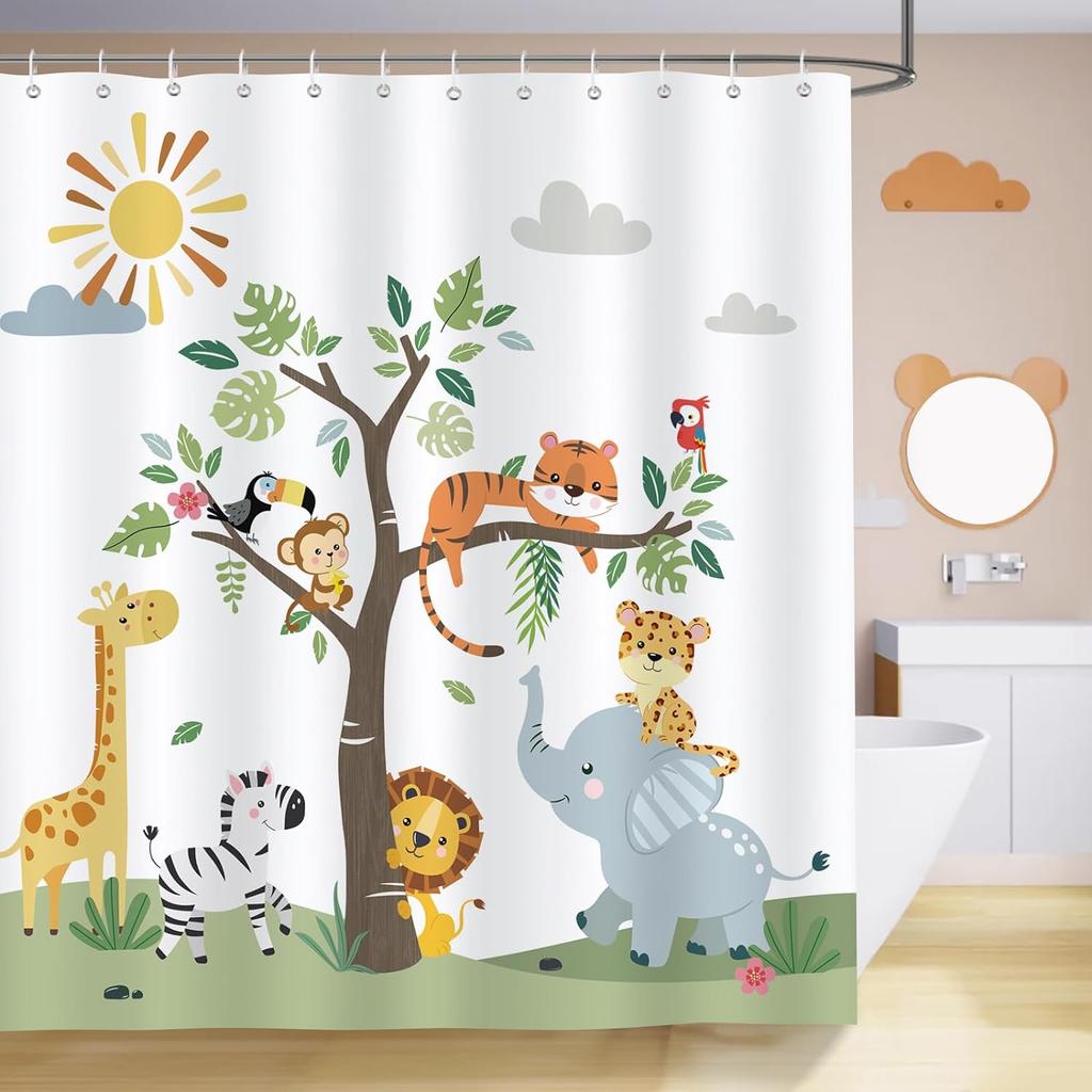 Cartoon Animals Shower Curtain Cute Giraffe Elephant Lion Floral Plant Leaves Dinosaur Funny Bath Curtains Fabric Bathroom Decor