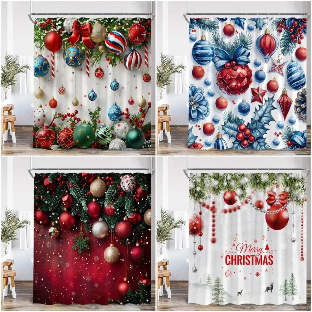 Chritsmas Shower Curtain Red Silvery Ball Xmas Balls Snowflake Pine Leaves Merry Christmas Winter Polyestert Bath Curtain Decor
