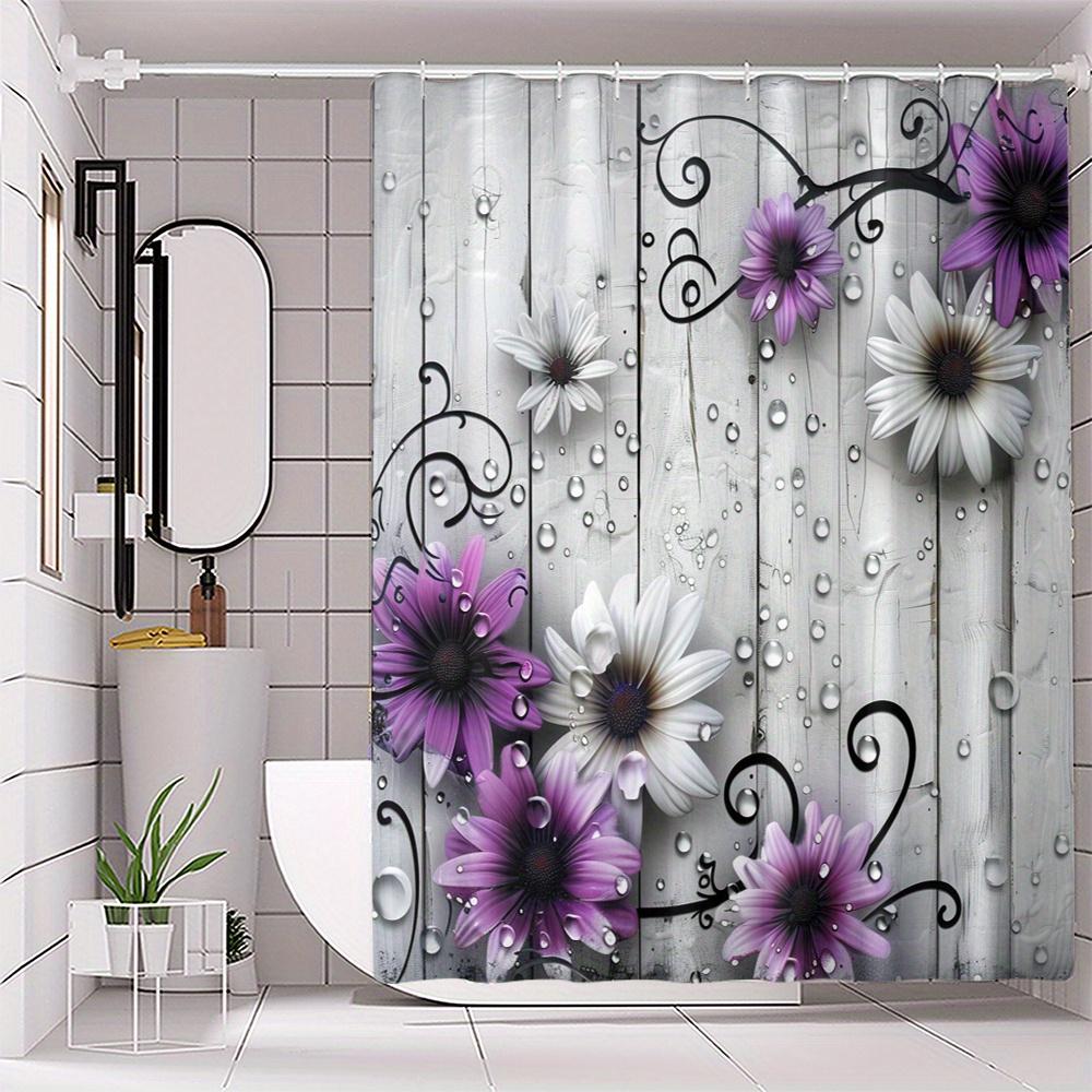 Purple Daisy Shower Curtain 3D Floral Design Wooden Background Water Droplets Bath Decor Waterproof Fabric Bathroom Curtain Set