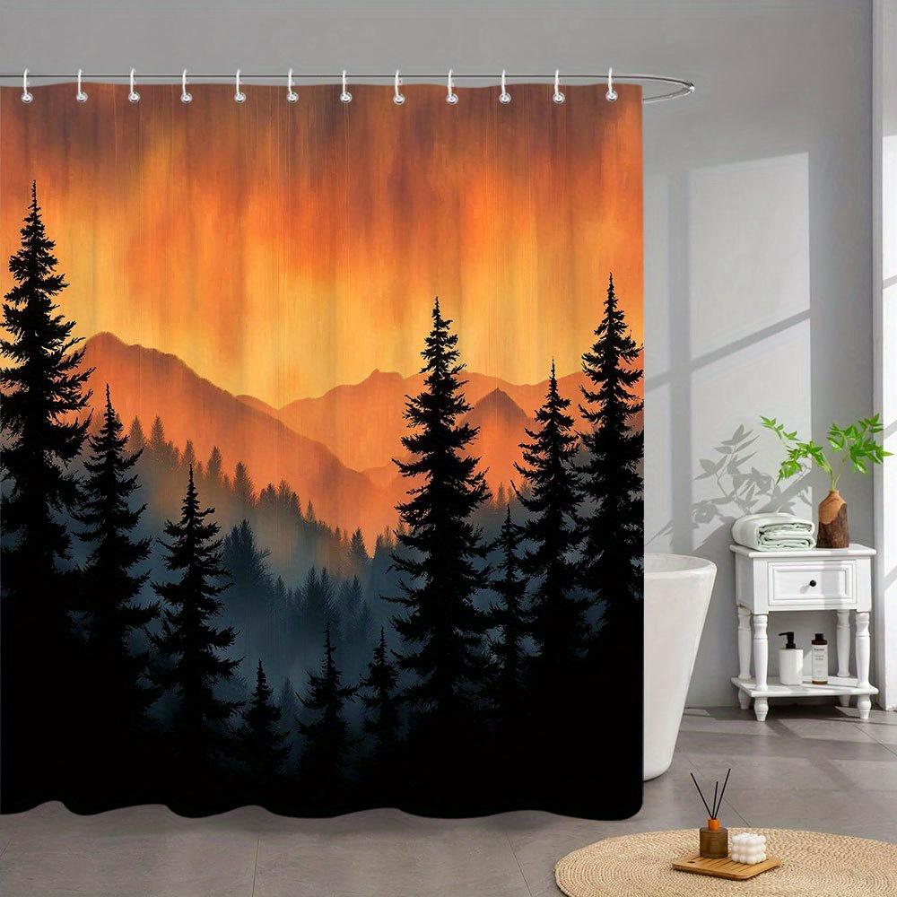 1pc Sunset Forest Shower Curtain - Tranquil Nature Landscape with Evergreen Trees & Misty Mountains, Orange & Yellow Sky Design,
