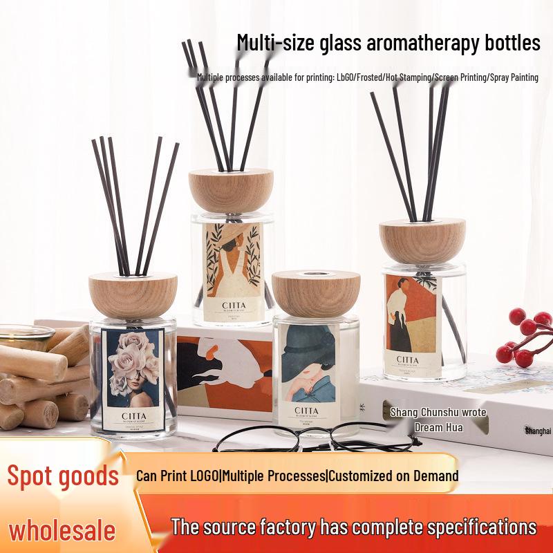 Wooden Lid Cylindrical Glass Aroma Diffuser Bottle, 120ml Flameless Car Refill, Transparent with Printing for Hotel Use.