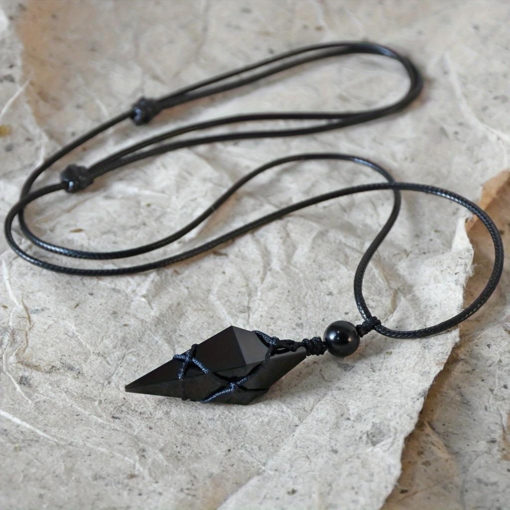 Natural Obsidian Necklace Handmade Bohemian Jewelry with Glossy Rhombus Faux Crystal Pendant Elegant and Minimalist Design for Women and Men