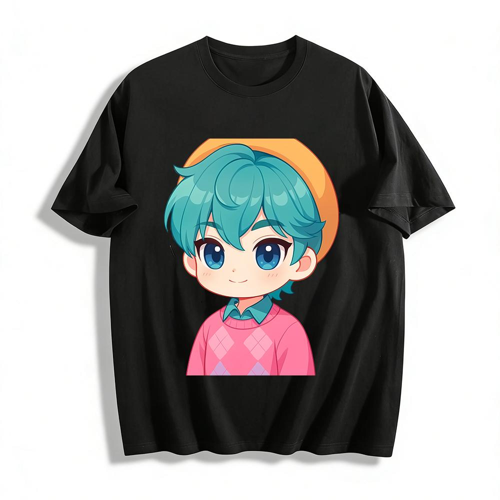 Cute Blue-haired Q-version Boy Print Top Casual Loose Pullover Versatile Knitwear For Kids Boys Girls Pure Cotton T-shirt
