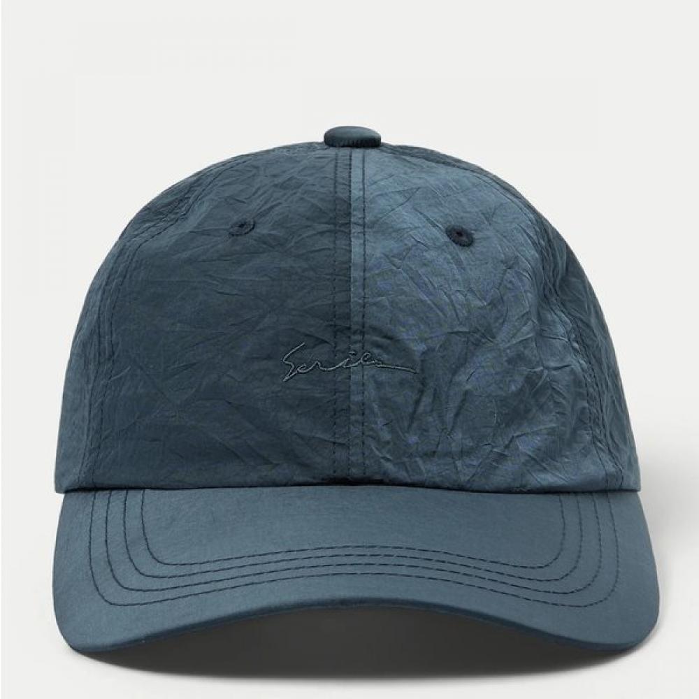 [series;] The Crease Ball Cap features natural creases and is made from basic crease material, allowing for easy wear. It is crafted from lightweight nylon for a comfortable fit. The back webbing strap allows for size adjustment, and the subtle logo embroidery adds a charming touch. The inner sweatband detail enhances sweat absorption functionality.