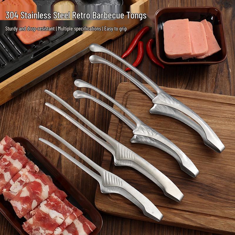 Retro Korean Style 304 Stainless Steel BBQ Grill Tongs with Round and Sharp Heads for Self-Service Restaurants