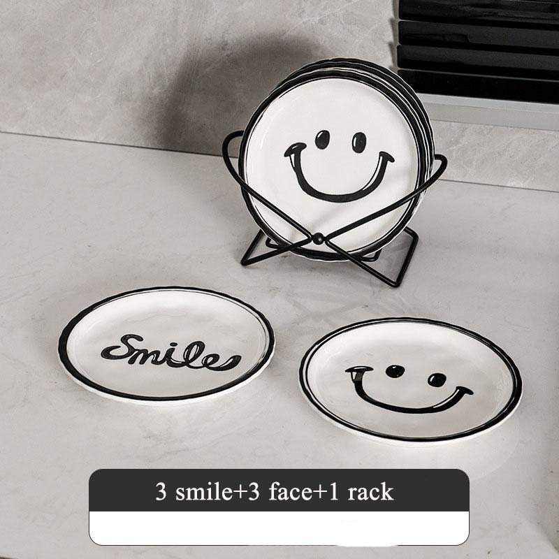 6PCS Smiling Plate Set Korean INS With Metal Rack Dessert Ceramic Plate Fruit Cake Dish Breakfast Bread Tray Dishs Decor Display