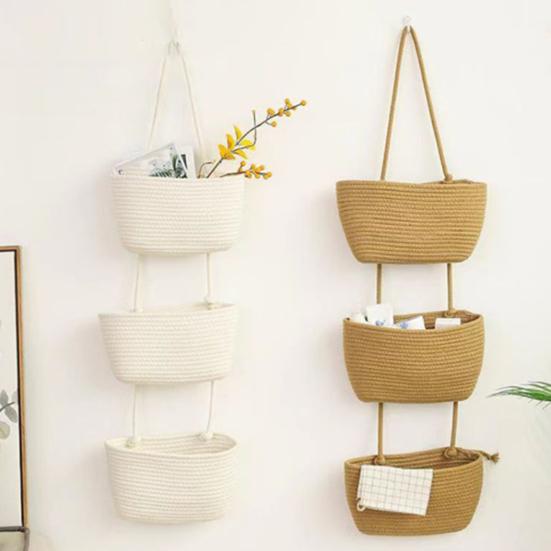 Rope Woven Storage Basket Boho Foldable Washable Hanging Baskets Multi-Tier Wall Mounted Organizer for Kitchen Produce Nursery Decor