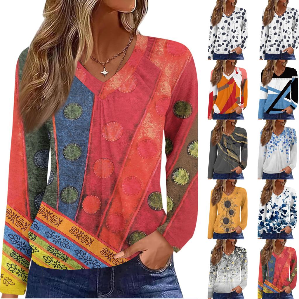 Women's Casual Fashion V-Neck Raglan Pleated Floral Print Long Sleeve Top