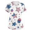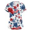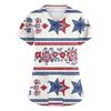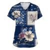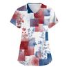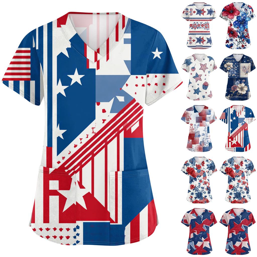 Women's Fashionable V-Neck Short-Sleeved Work Top With Pockets And Independence Day Print Uniform