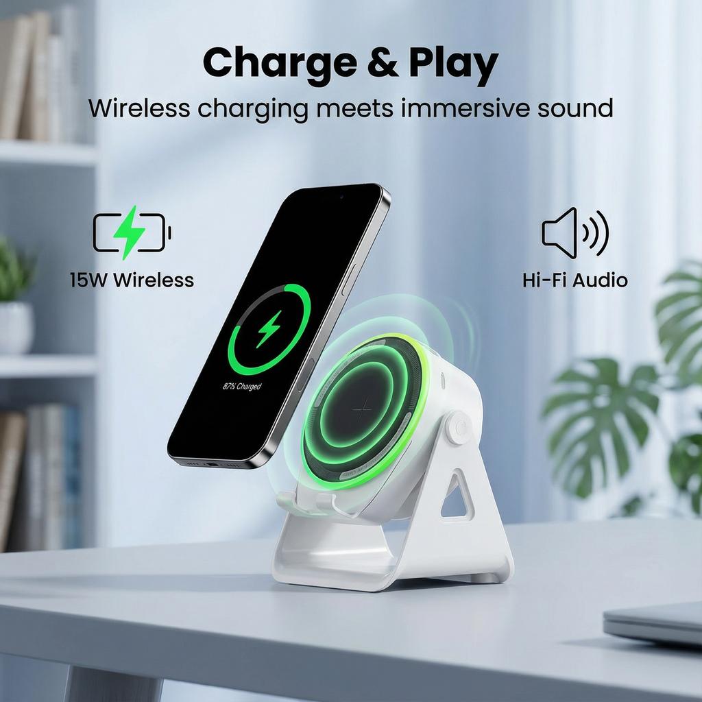 New Multi-functional Wireless Charging Inductive Speaker with Rotating Phone Stand and Bluetooth Speaker