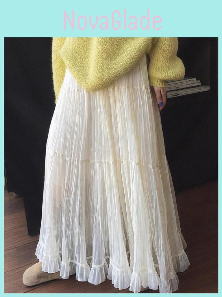 This long A-line skirt features a solid color design with a stylish mesh panel, crafted from durable polyester fabric.The skirt's pleated details add texture, making it suitable for casual or everyday wear. Ideal for spring and autumn, it pairs well with various tops and shoes. Easy to care for, simply wipe clean with a damp cloth for maintenance.