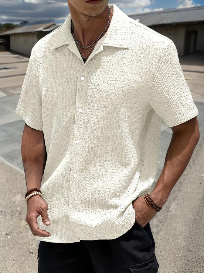 This Men's Summer Solid Color Short Sleeve Shirt is crafted from high-quality polyester, offering a lightweight and breathable feel perfect for warm weather. It features a minimalist solid pattern with a distinctive tailored neckline that adds a touch of sophistication. The short sleeves enhance comfort, making it an ideal choice for casual outings or relaxed office wear during the summer months.