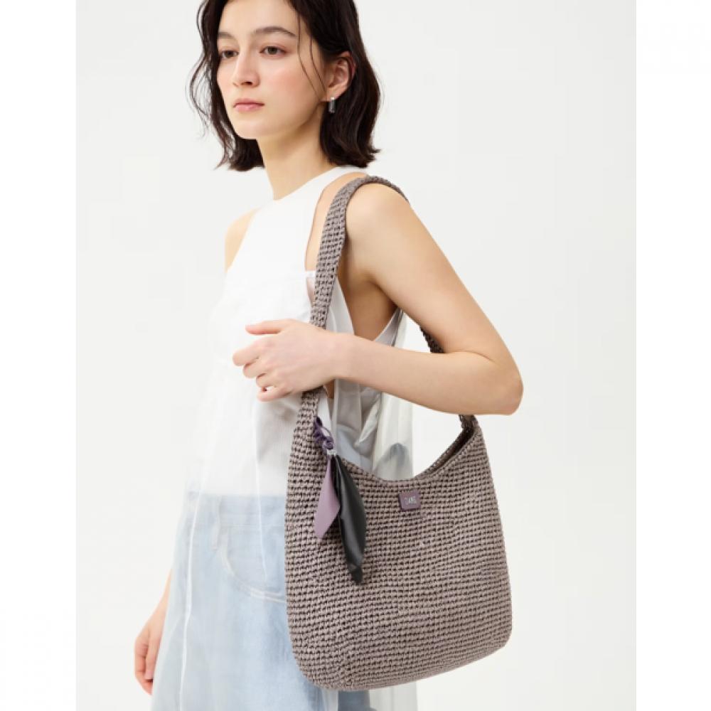 The DCBA6E571G1 [MISTY FLOWER RAFFIA] Gray Real Raffia Twisted Mesh Shoulder Bag features a distinctive weave and logo embellishment for a stylish exterior. It's perfect as a summer accessory, using a raffia material that embodies seasonal charm. Additionally, it includes a dust bag for easy storage.