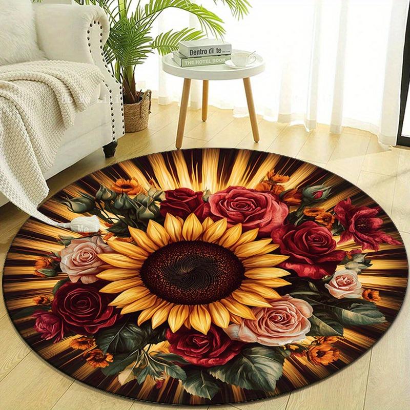Sunflower and Roses Printed Round Area Rug - Polyester Non-Slip Chair Mat for Living Room, Bedroom, Home Decor - Floral Blooming Pattern, Wa