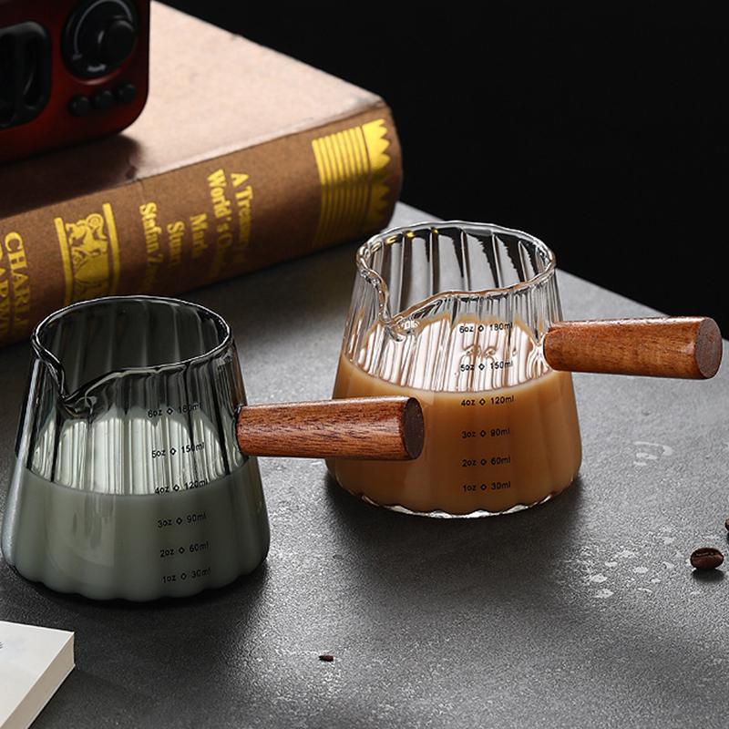 90ml/120ml/180ml/Wooden Handle Glass Espresso Measuring Cup Horizontal Stripes High Temperature Heat Resistant Glass Milk Jug