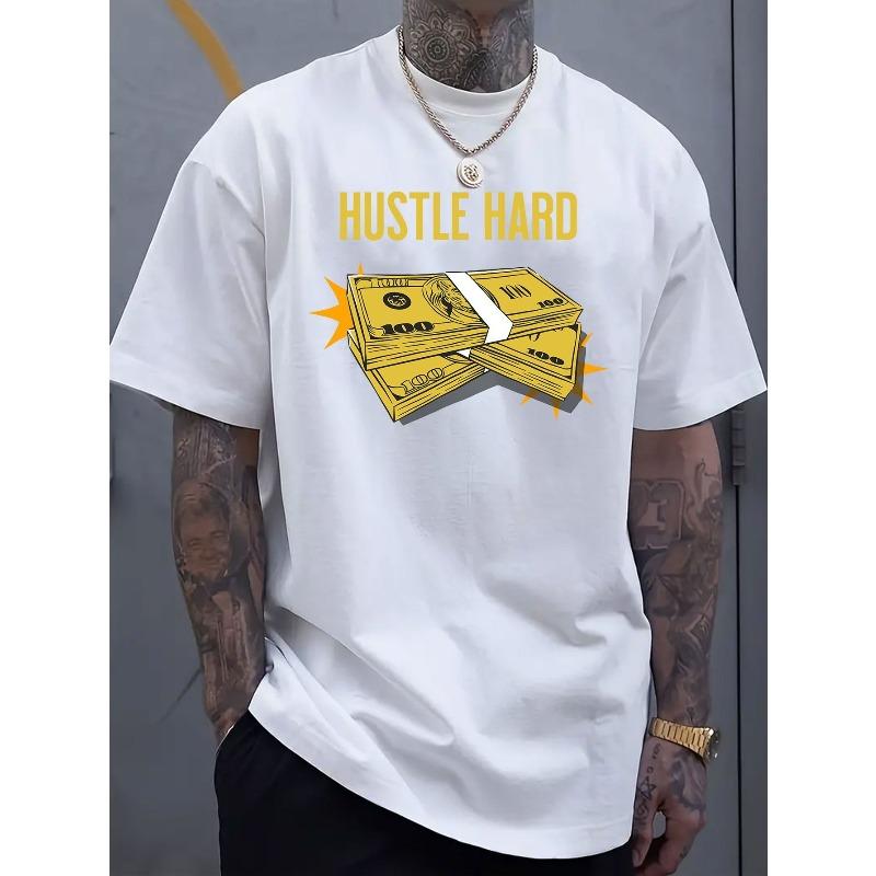 European Size Men's Oversized T-Shirt with Bold HUSTLE HARD Money Stack & Dollar Bill Graphic - White & Yellow Print Streetwear Tee