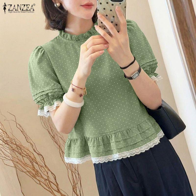 ZANZEA Women Casual Round Neck Polka Dot Print Short Sleeve Blouse