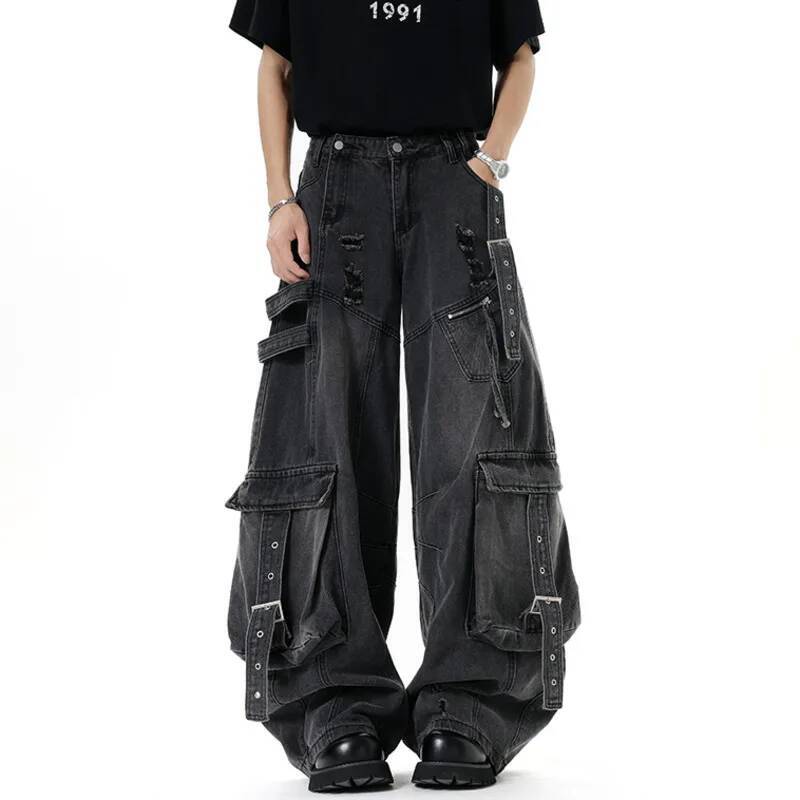 STREETRICH American Style Men's Jeans Solid Color Multi Pockets Casual Worn-out Trousers Deconstruction Wide Leg Denim Pants