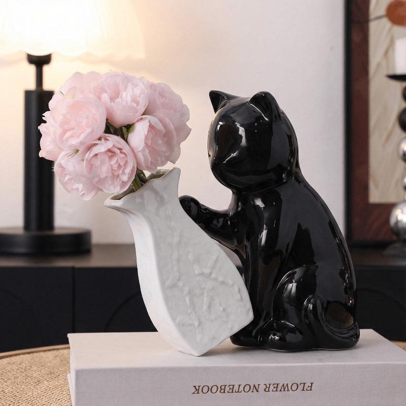 Creative Black Ceramic Cat Vase Countertop Decoration Fresh Flower Hydroponic Vase Abstract Cat Dining Table Living Room Decor