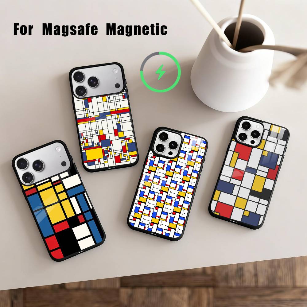 Grid T-TOPLBPCS M-Mondrian Phone Case For iPhone17,16,15,14,13,12,11 Plus,Pro Max Magnetic For Magsafe Wireless Charging
